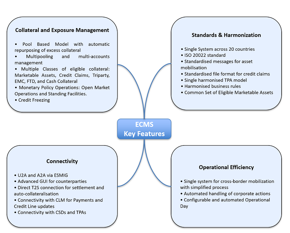 Besides to the Integration within the Eurosystem’s market infrastructure landscape, ECMS brings a host of innovations and benefits to the Eurosystem axed around the harmonisation of collateral management practices, the efficiency gained from operating one single system and the connectivity via ESMIG (Eurosystem Single Market Infrastructure Gateway).