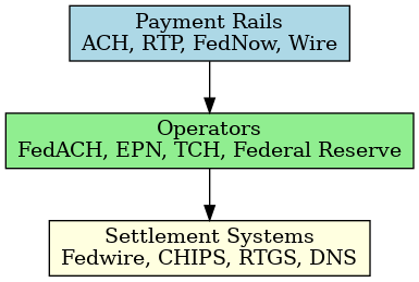 Settlement systems: Fedwire, CHIPS, RTGS and DNS. These are the systems that make sure that banks pay each other at the end of the day (DNS) or right away (RTGS). Using the directions from the payment rails that are enforced by the Operators, they make the final push of funds to the correct bank after all the front end has been handled.