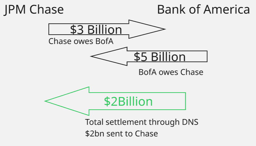 DNS - Deferred Net Settlement is a system that is the direct opposite of RTGS from above. It settles payments on the backend in batches which are frequently netted. For example, CHIPS is using DNS system which means that it aggregates multiple payments into one. If bank XYZ sends $10 to bank BIT and the same day, bank BIT sends bank XYZ $5, there will be just one transaction though DNS: from bank XYZ to bank BIT totaling $5.