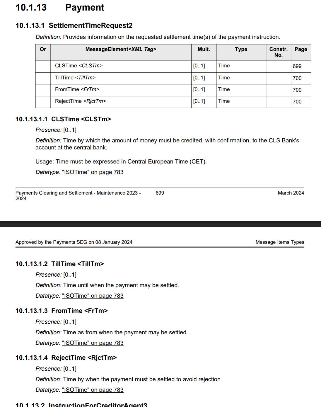 Settlement instructions: settlement system selected (RTGS, DNS or other country-specific choice), operator that will be doing the clearing, settlement date etc. IF you don’t understand the sentence above, I highly encourage you to read my article about US interbank payments ecosystem. Yet another screenshot from the documentation that shows the information included in an ISO 20022 message and some definitions: