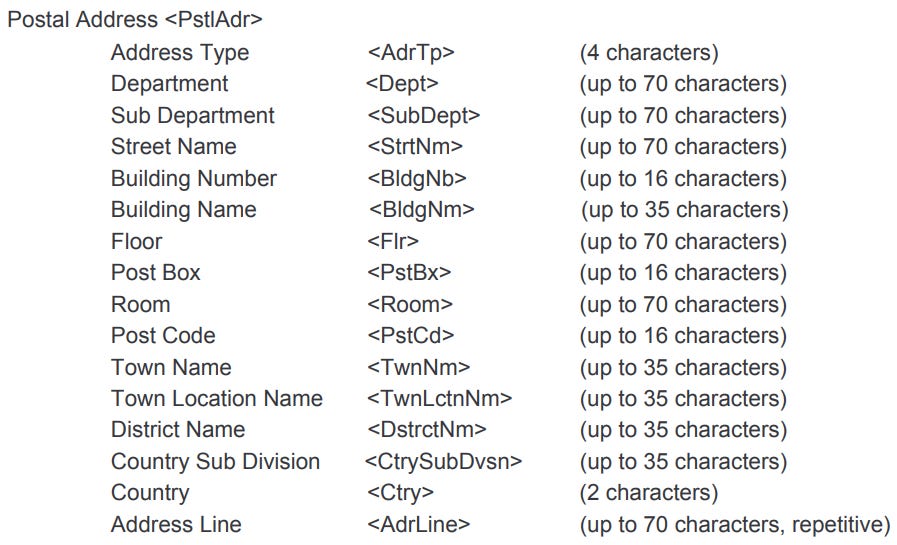 As you can tell, the input options are far broader than those presented by a standard 3-line method. And here lies the beauty of ISO 20022 - data richness. More input options presented → more edge-cases covered → less failed payments → faster fund delivery → cheaper maintenance of the system allowing for the true STP (Straight Through Processing).